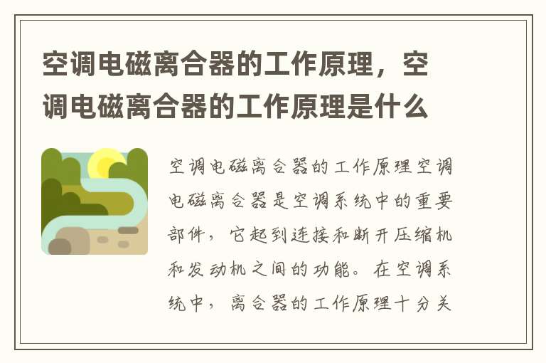 电磁离合器是一种采用电磁原理工作的设备,它通过电磁线圈产生磁力将两个部件连接或者断开。在空调系统中,电磁离合器主要用于连接和断开压缩机和发动机之间的动力传递。当空调工作时,电磁离合器将压缩机与发动机连接,使压缩机得以运转;当空调停止工作时,电磁离合器将压缩机与发动机断开,使其停止运转。